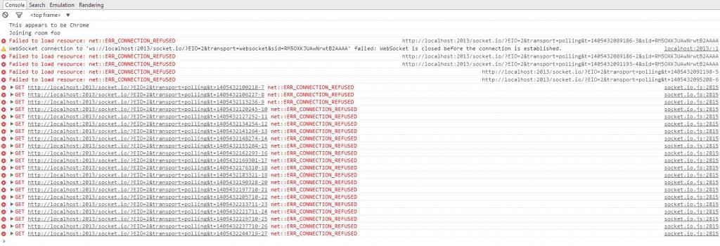 I'm trying to run Step 5 from the WebRTC codelab, but I am encountering errors. I'm using node.js and I ran the commands to install node-static and socket.io. When I try to run the demo, the popup opens to enter a room name, but when I click on "OK" I get the following errors.