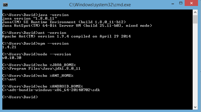 Also I tried out to install cordova, and it installs but when I try to cordova add android platform it fails and says that ant is not installed I have ant installed, I already search all over google and stackoverflow for answers about this issue, I am totally sure that my path is ok and that ant is installed because it returns the version when I write in the cmd ant -version Also the cmd I am using haves Admin privileges. I tried to install phonegap version 3.4 and it installed but when I tried to compile it shows ant error.